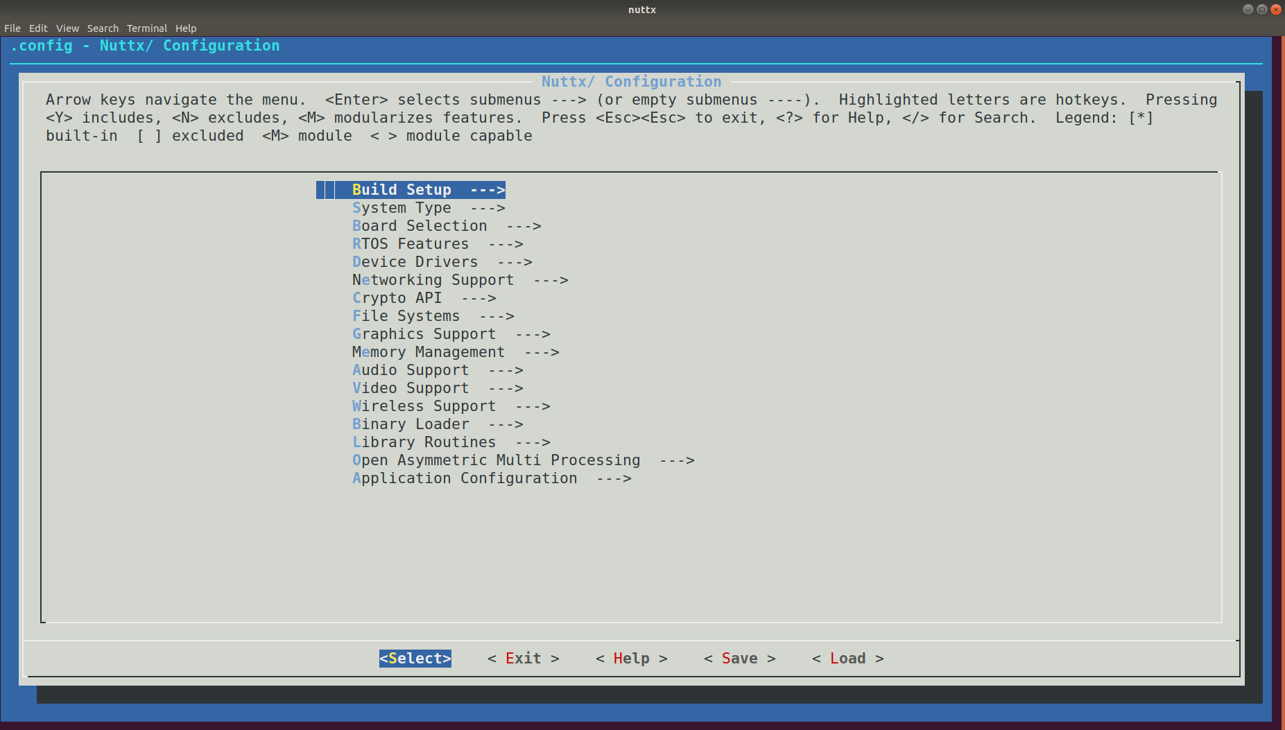 menuconfigand save the modified configuration. Use the 🡸 and 🡺 arrow keys to navigate the lower menu. If you select you will be prompted to save the config.Build with the new Configuration