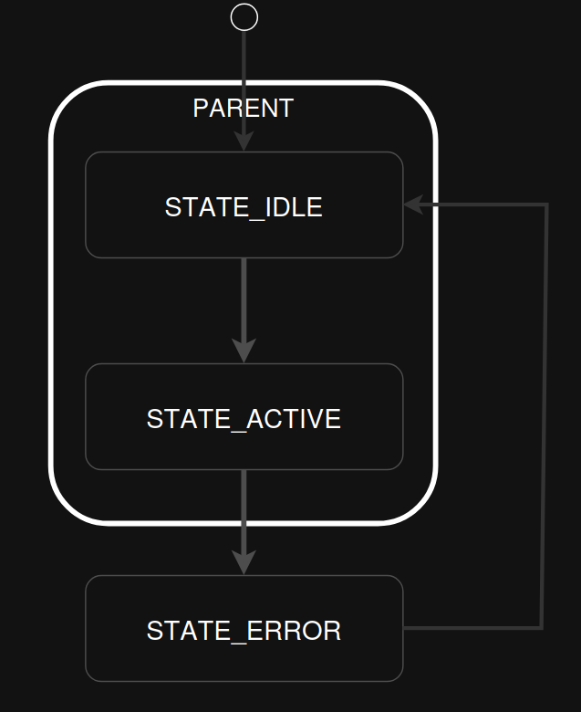 idle_entryfunction.Transitioning from one sibling to another with a shared ancestry does not re-execute the ancestor’s entry action or execute the exit action. For example, the parent_entry function is not called when transitioning from IDLE to ACTIVE, nor is the parent_exit function called.